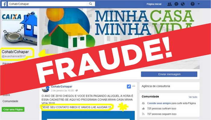 Os paranaenses interessados em adquirir uma casa própria por meio dos projetos habitacionais da Cohapar devem ficar atentos a possíveis golpes aplicados na internet. Recentemente, a empresa identificou impostores que utilizam imagens da empresa nas mídias sociais, como o Facebook, além da Caixa Econômica Federal e Minha Casa Minha Vida, com o intuito de cobrar por serviços que, na verdade, são prestados gratuitamente à população.