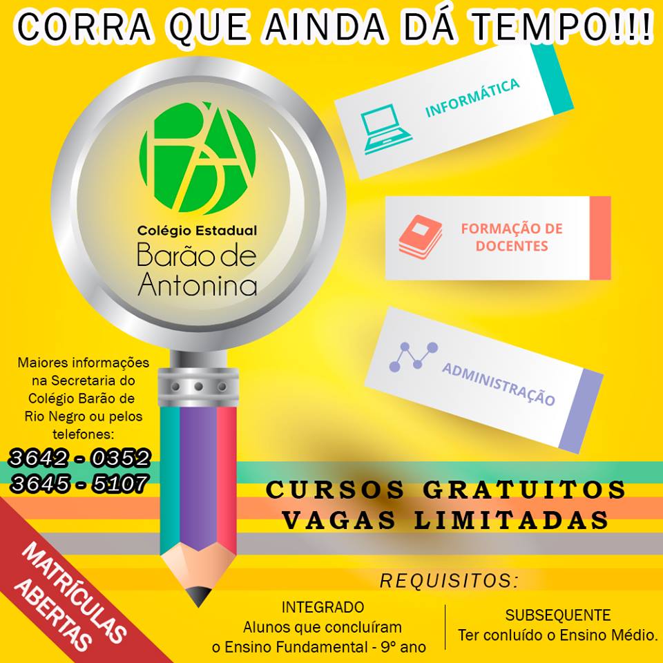 Estão abertas as inscrições para cursos técnicos gratuitos no Colégio Barão de Antonina de Rio Negro.