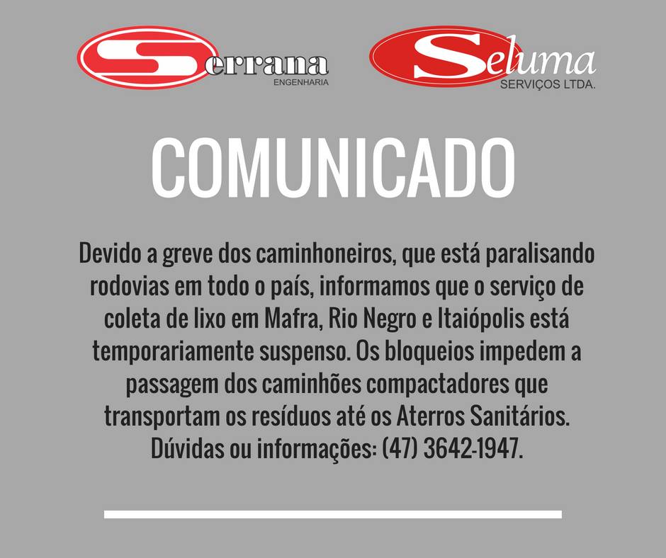 A empresa Seluma Serviços, responsável pela coleta de lixo em Rio Negro, Mafra e Itaiópolis comunica que devido à greve dos caminhoneiros, que está paralisando rodovias em todo o país, o serviço de coleta cidades está temporariamente suspenso. Segundo a empresa, os bloqueios impedem a passagem dos caminhões compactadores que transportam os resíduos até os aterros sanitários.