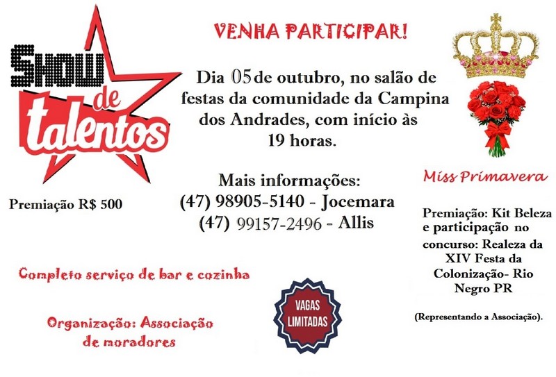 A comunidade da Campina dos Andrades realizará no dia 05 de outubro o Show de Talentos e o concurso Miss Primavera com ótima premiação. Confira na imagem as informações: