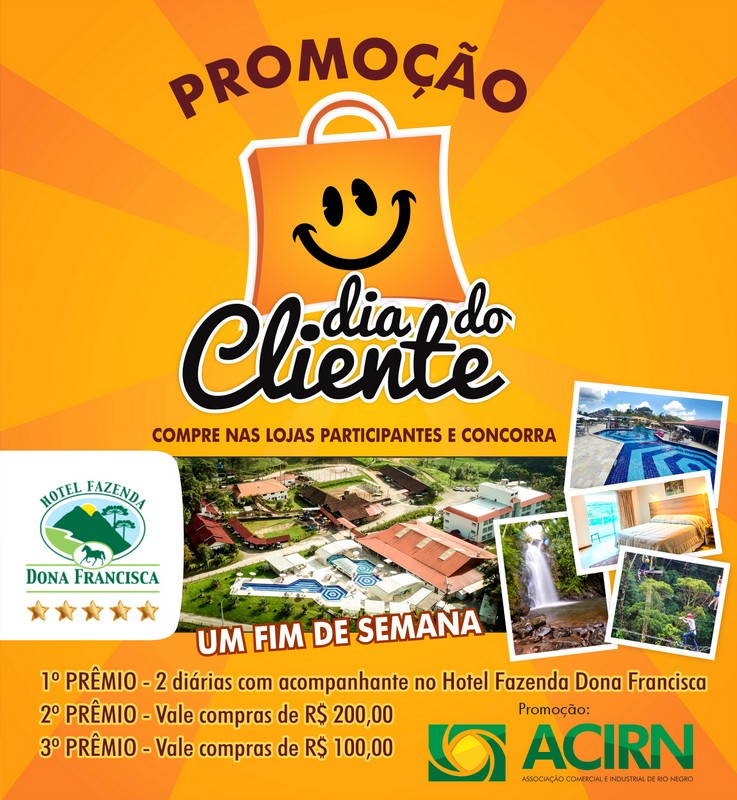 Pelo terceiro ano a Associação Comercial e Industrial de Rio Negro (ACIRN) vai celebrar o Dia do Cliente. Nessa ocasião, lojistas e prestadores de serviços se organizam para estreitar relações com a pessoa mais importante do comércio: o cliente. Entre os dias 26 de agosto e 14 de setembro cerca de 60 empresários de Rio Negro e Mafra estarão unidos para melhorar ainda mais o atendimento aos seus clientes, através da Promoção Dia do Cliente, que vai sortear entre os participantes um final de semana com acompanhante no Hotel Fazenda Dona Francisca. A promoção ainda irá sortear como segundo e terceiro prêmios, um vale compras no valor de R$200 e de R$100.