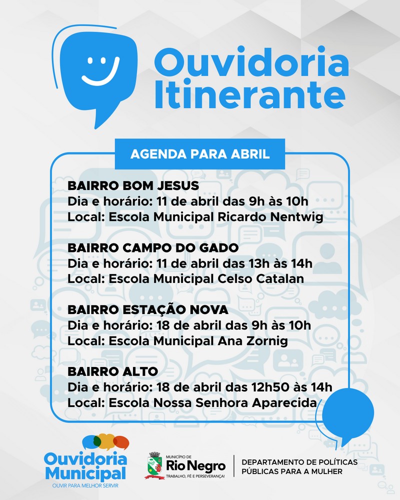 Por estas razões o projeto Ouvidoria Itinerante vai até os bairros para divulgar a importante missão realizada pelo municÃpio de Rio Negro. A ação deve ocorrer em todos os meses. Neste mês de abril a ação será realizada nos dias 11 e 18 conforme o cronograma abaixo: