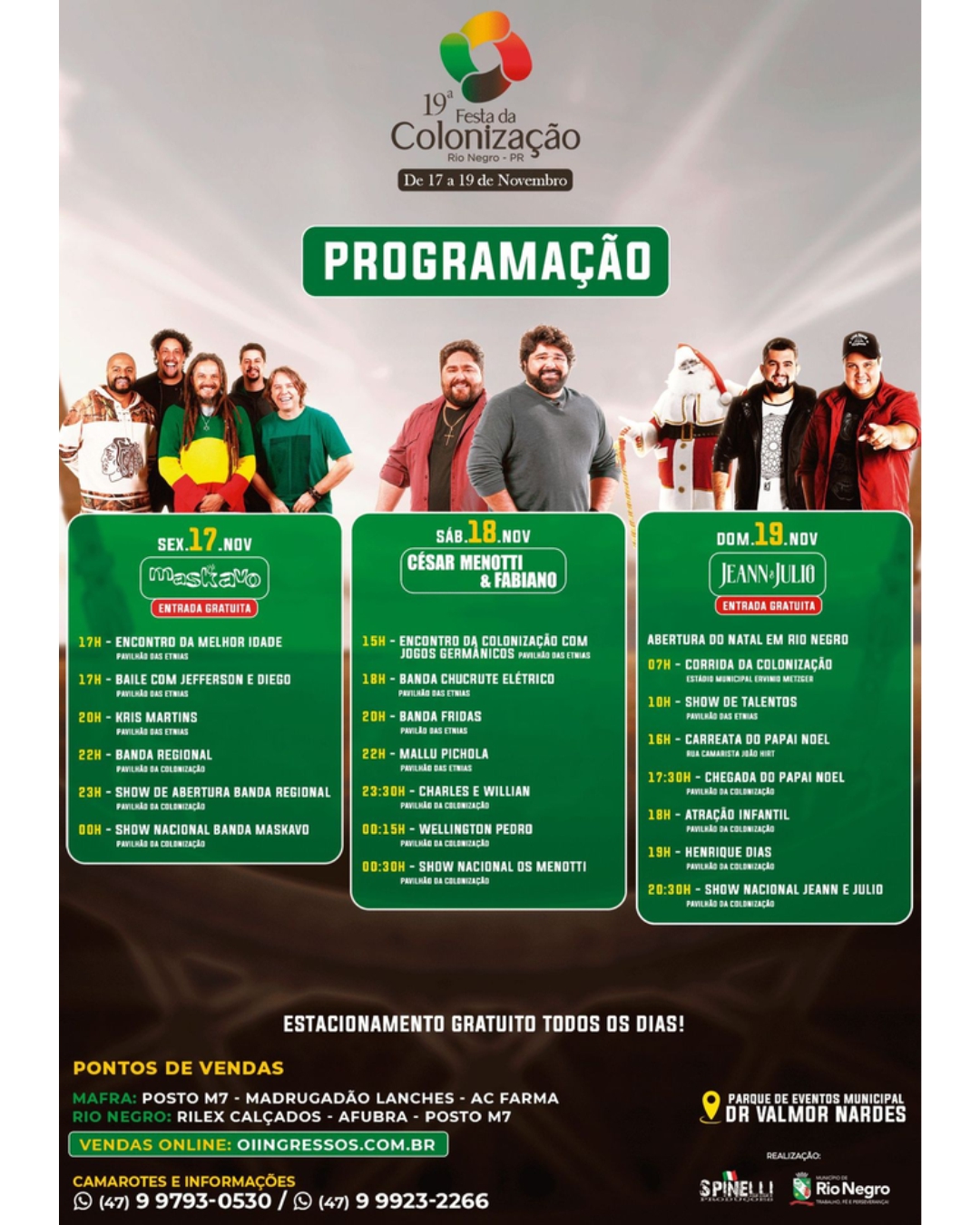 Na próxima quarta-feira, dia 15 de novembro, o Município de Rio Negro completa 153 anos de emancipação política. Para comemorar, nos dias 17, 18 e 19 de novembro será realizada a 19ª Festa da Colonização com uma vasta programação para toda a família.
