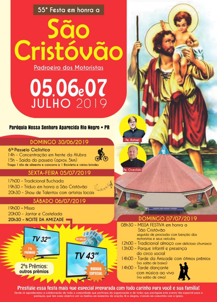A tradicional Festa de São Cristóvão chega a sua 55ª edição em Rio Negro. Serão diversas atrações nos dias 06, 06 e 07 de julho. Confira na imagem: