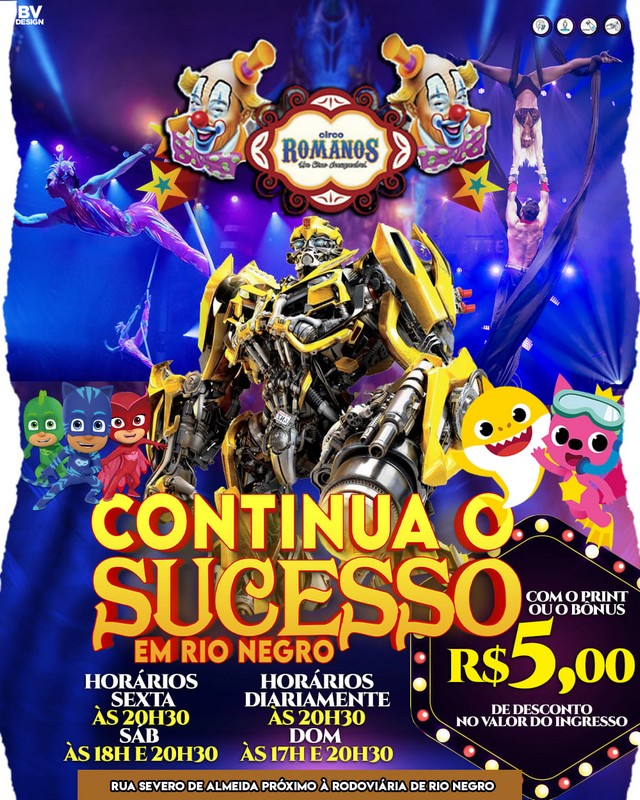 O fabuloso Circo Romanos – o mais alegre do Brasil – está em Rio Negro com espetáculo completo do circo e diversas atrações infantis. Ele está armado na Rua Severo de Almeida, próximo da rodoviária, no bairro Campo do Gado.