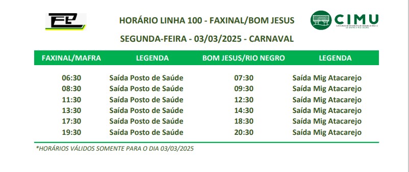 O Consórcio Intermunicipal de Mobilidade Urbana (CIMU) de Rio Negro-PR e Mafra-SC informa que no dia 03 de março, (segunda-feira), véspera de Carnaval, somente a linha Faxinal/Bom Jesus estará em operação, seguindo os horários dos sábados.