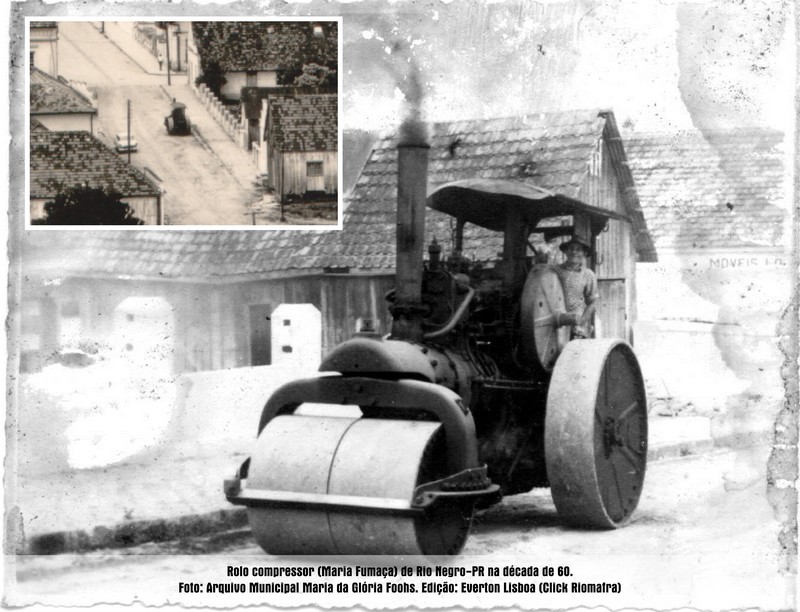 A foto abaixo mostra o histórico rolo compressor de Rio Negro (também conhecido como Maria Fumaça) e seu único operador, o Sr. Henrique Lazzarine. O jornalista rionegrense Everton Lisboa procurou e encontrou outra foto que mostra a máquina no mesmo local. Observando os detalhes das duas fotos é possível perceber que o local é o mesmo. Não há como saber com exatidão, mas vale usar a imaginação: talvez o fotógrafo esteja dentro do carro, após fazer esse registro histórico.