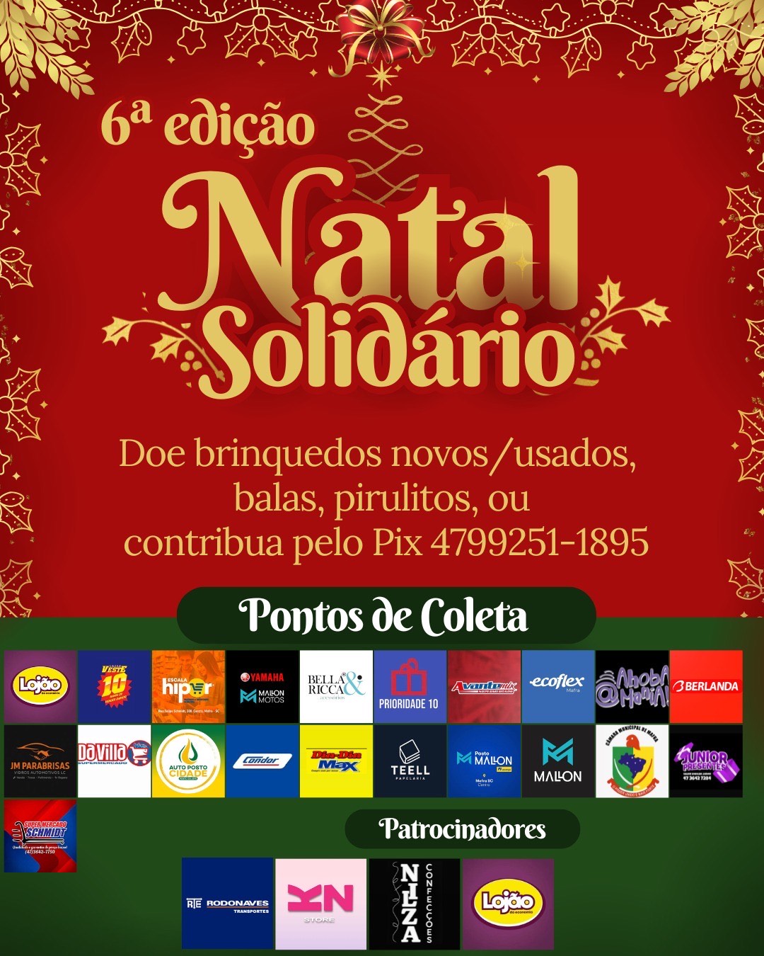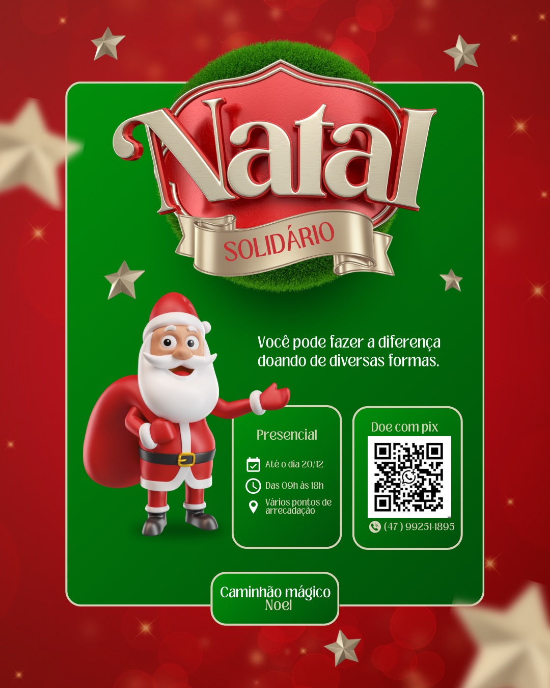 O caminhão do Natal Solidário 2025 percorrerá a cidade a partir do dia 21 de dezembro com as entregas. Uma bonita decoração com luzes será realizada com a presença do Papai Noel para encantar ainda mais as crianças. O projeto busca patrocinadores para além dos presentes e guloseimas, ajudar com os custos da decoração.