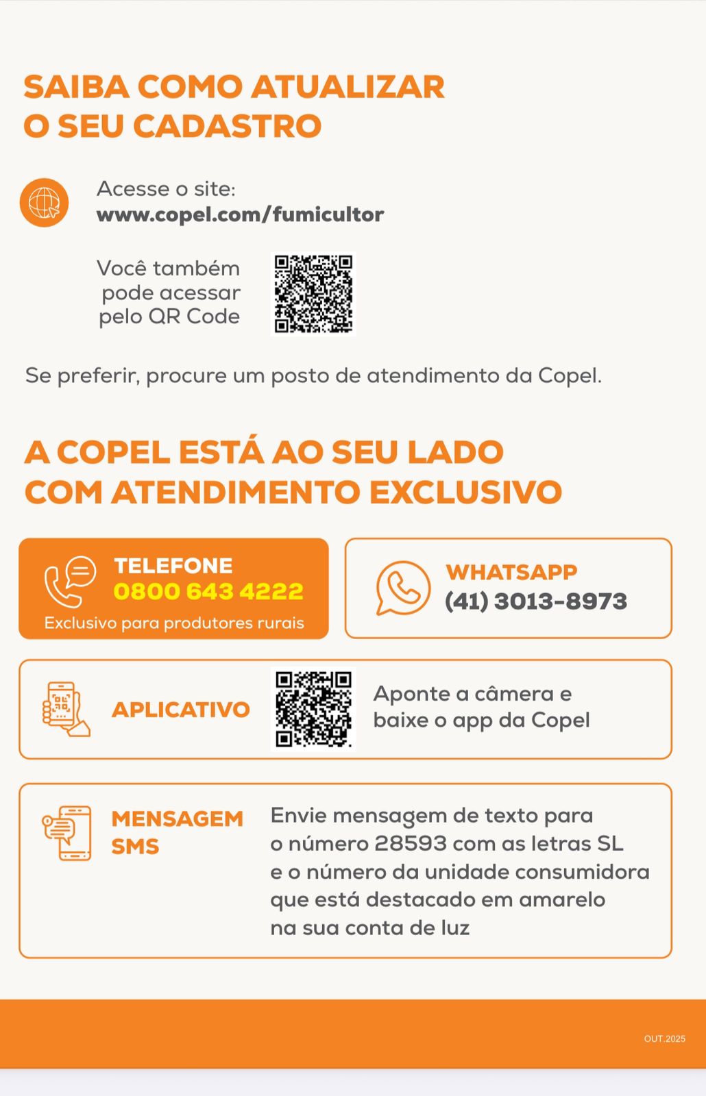 A Companhia Paranaense de Energia (Copel) disponibiliza um canal de atendimento exclusivo para os produtores rurais. O contato garante prioridade no atendimento e maior agilidade na resolução de eventuais interrupções de energia.