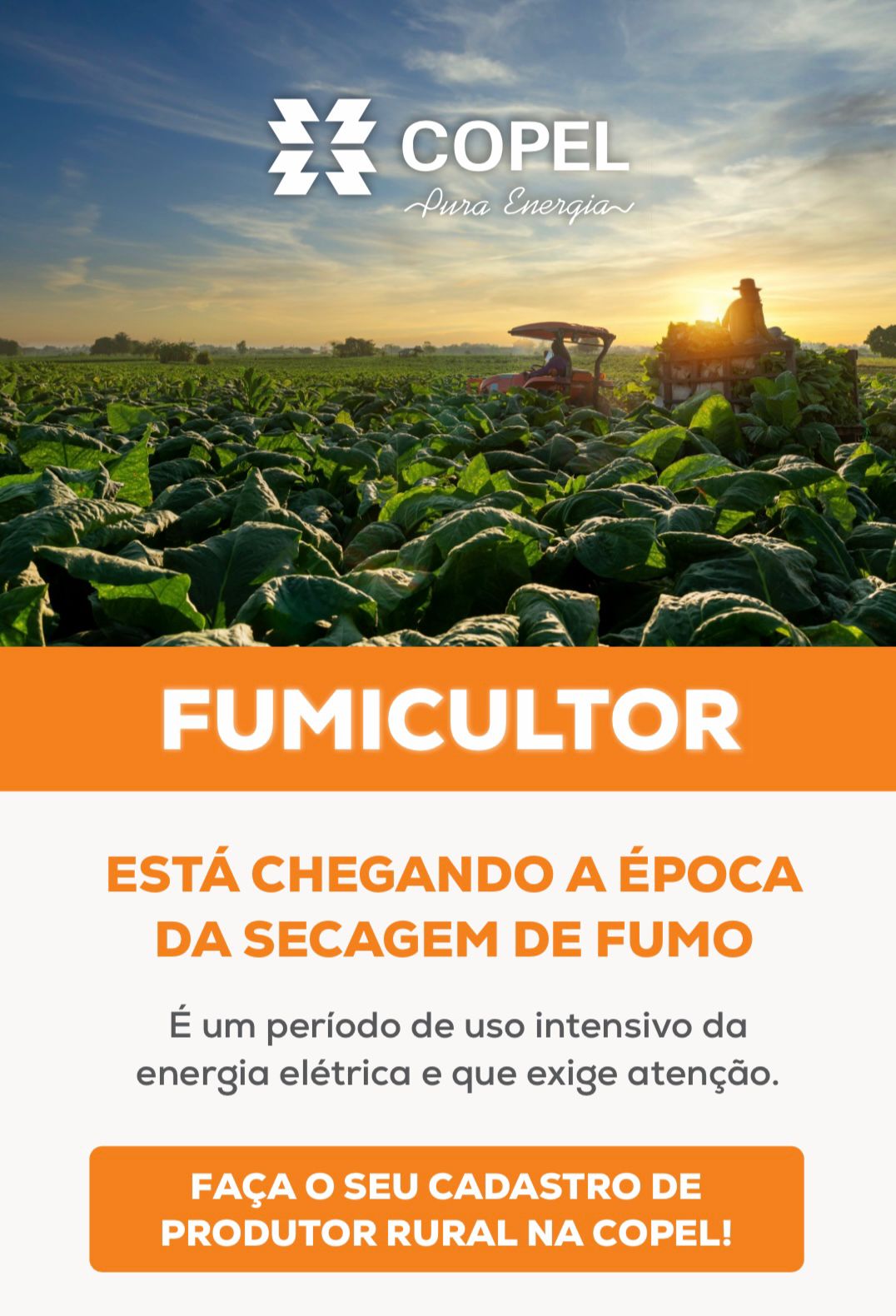 A época de secagem de fumo é um período muito sensível no beneficiamento dessa cultura. É um período de uso intensivo da energia elétrica e que exige atenção, por isso a Copel orienta que produtores rurais realizem ou atualizem seus cadastros.