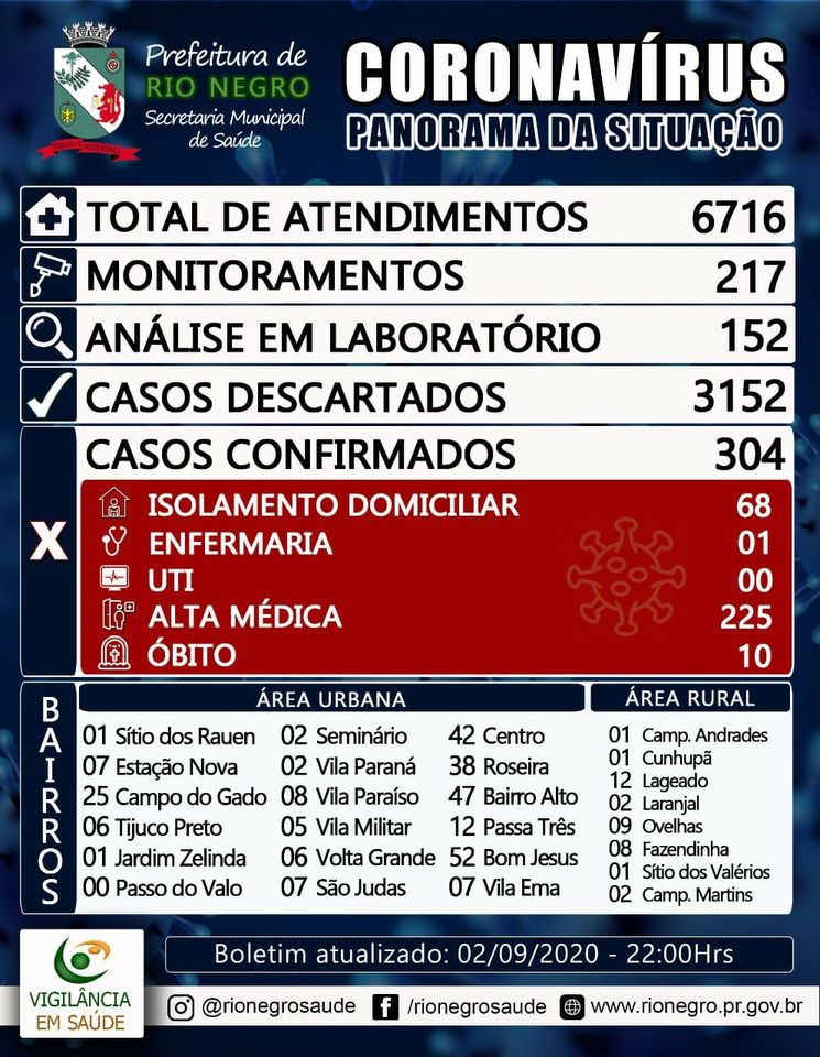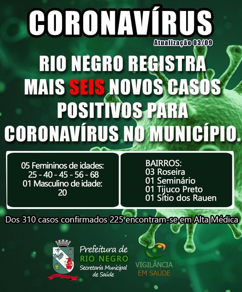 Atualmente a cidade de Rio Negro tem 310 casos positivos de Covid-19, sendo que 225 pessoas já estão recuperadas. Confira os últimos boletins divulgados: