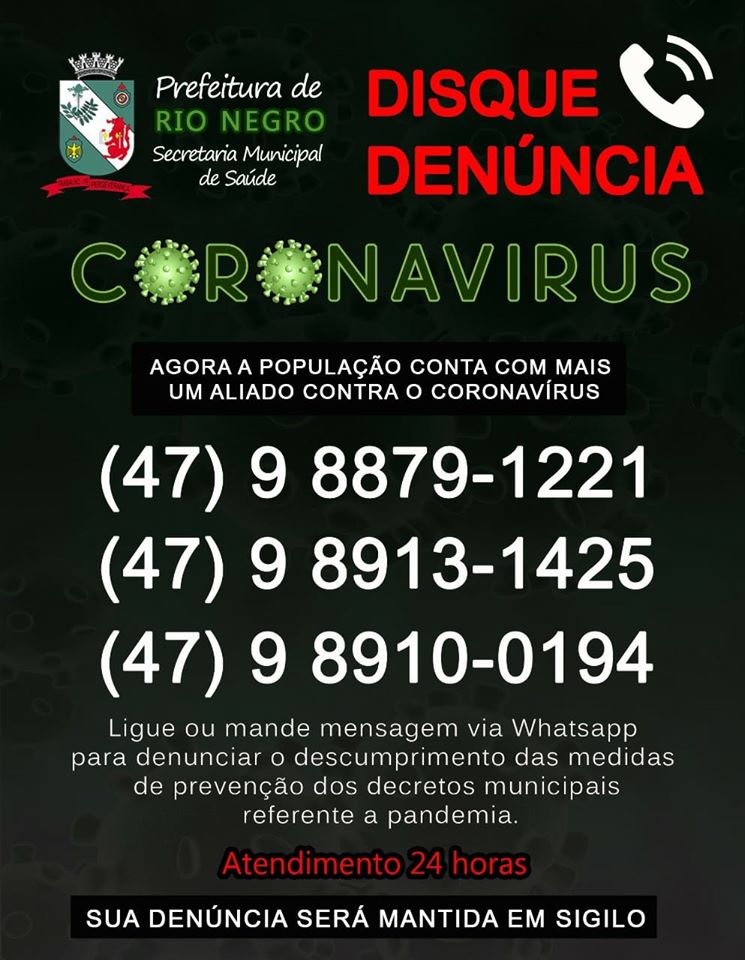 O prefeito de Rio Negro, no uso de suas atribuições legais, considerando o Decreto nº 021, de 17 de março de 2020, e considerando os Decretos Municipais vinculados com medidas de enfrentamento a pandemia pelo Covid-19, decretou a criação do “Disque Denúncia”, como canal de comunicação/denúncia entre a população e a Secretaria Municipal de Saúde, através da Equipe da Força Tarefa Covid-19.