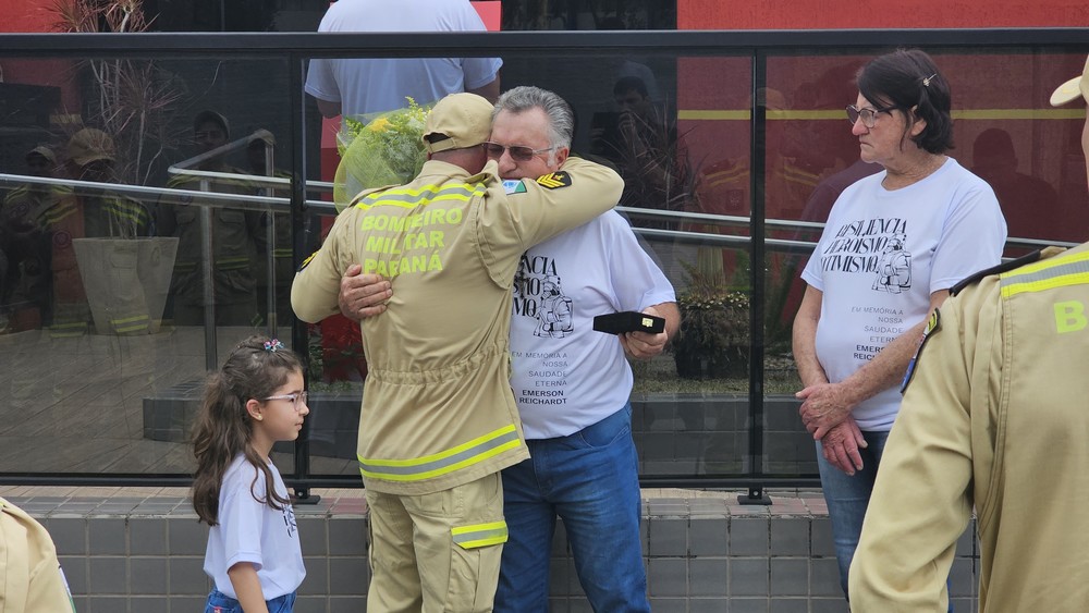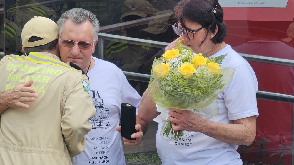A homenagem foi feita ao dedicado soldado que perdeu a vida em 2021 no litoral paranaense. A cerimônia reuniu soldados, autoridades locais e do Corpo de Bombeiros do Paraná e Santa Catarina e os familiares e amigos do soldado Emerson Reichardt. Representando o Município de Rio Negro, o prefeito James Karson Valério enalteceu em seu discurso a importância da justa valorização ao soldado Emerson Reichardt.