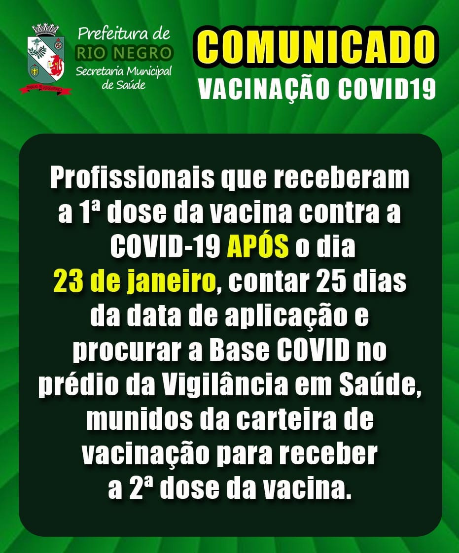 A Secretaria de Saúde da cidade de Rio Negro comunica que os profissionais que receberam a 1ª dose da vacina contra a Covid-19 nos dias 22 e 23 de janeiro, devem comparecer no prédio da Vigilância em Saúde, no dia 18 de fevereiro, das 8h às 12h, munidos da carteira de vacinação para receber a 2ª dose da vacina.