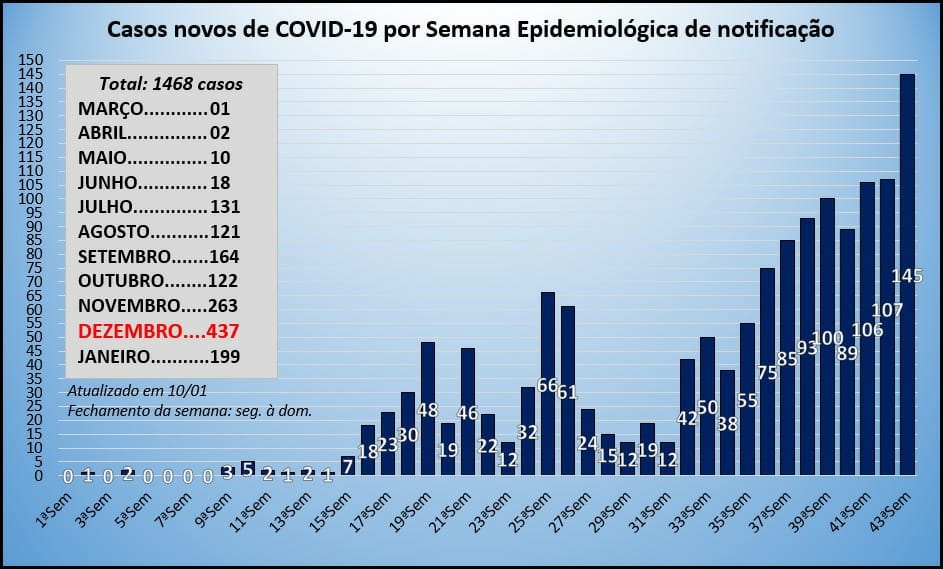 Somente em dezembro foram registrados 437 casos positivos da doença. Neste mês de janeiro já foram registrados 199 casos. Confira abaixo o gráfico.
