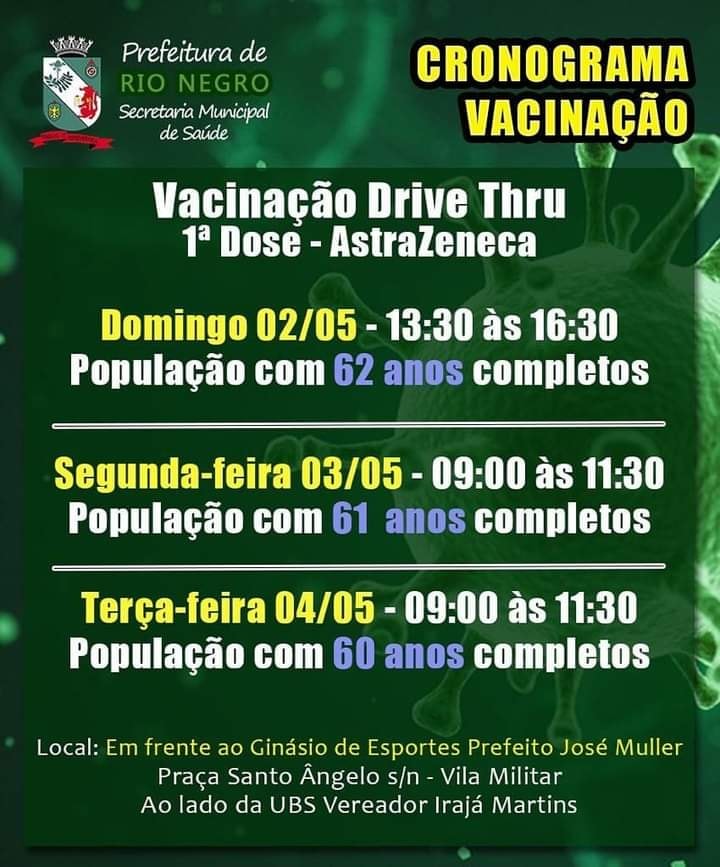 A cidade de Rio Negro divulgou o cronograma da vacinação contra a Covid-19 para esta semana. Confira: