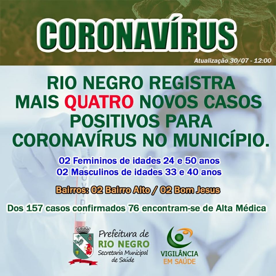 Quatro novos casos de Covid-19 foram confirmados em Rio Negro nesta quinta-feira. Dos 157 casos confirmados, 76 pessoas encontram-se recuperadas.
