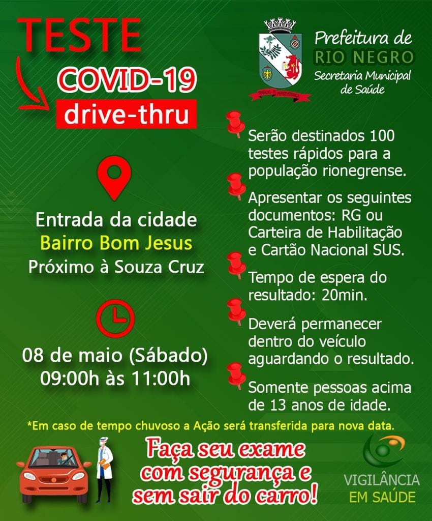 Neste sábado (08), a Secretaria de Saúde de Rio Negro realizará testagem gratuita no formato drive-thru no bairro Bom Jesus, na entrada da cidade, próximo à Souza Cruz.