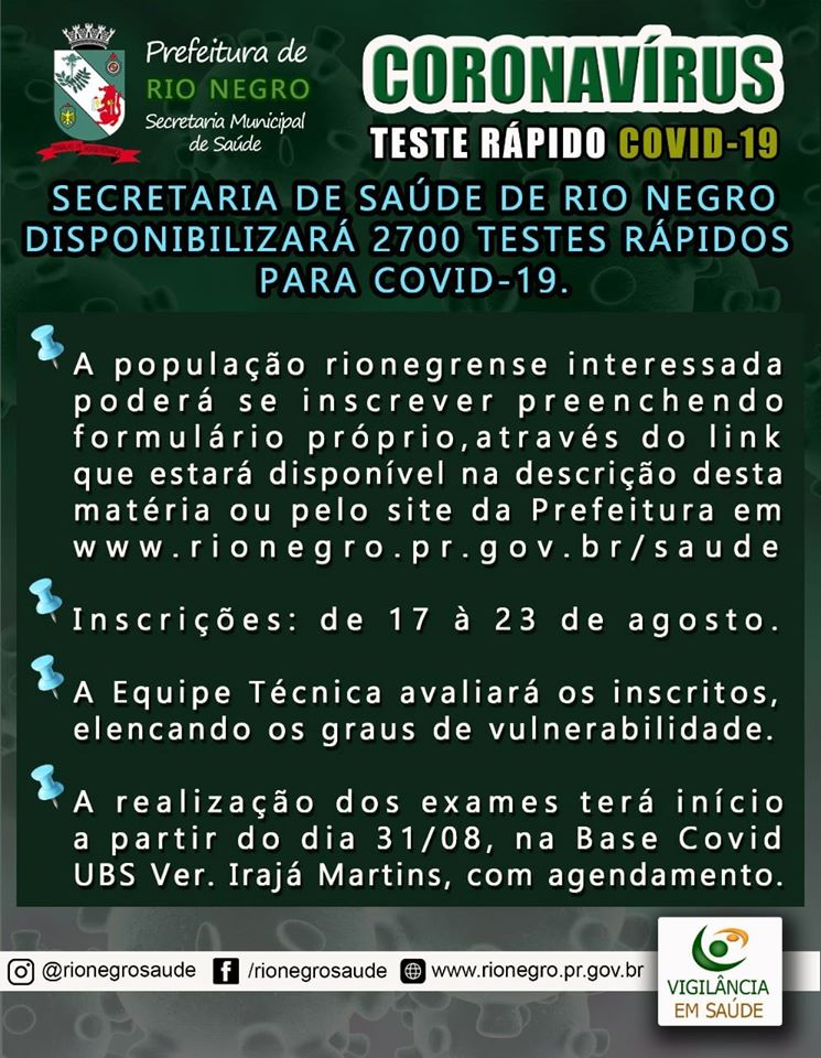 A Secretaria de Saúde de Rio Negro fará 2700 testes rápidos para a Covid-19.