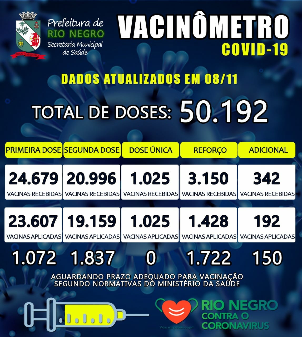 A cidade de Rio Negro-PR já aplicou 45.411 doses da vacina contra a Covid-19. Os dados são do “Vacinômetro” divulgado nesta terça-feira (09) pela Secretaria Municipal de Saúde.
