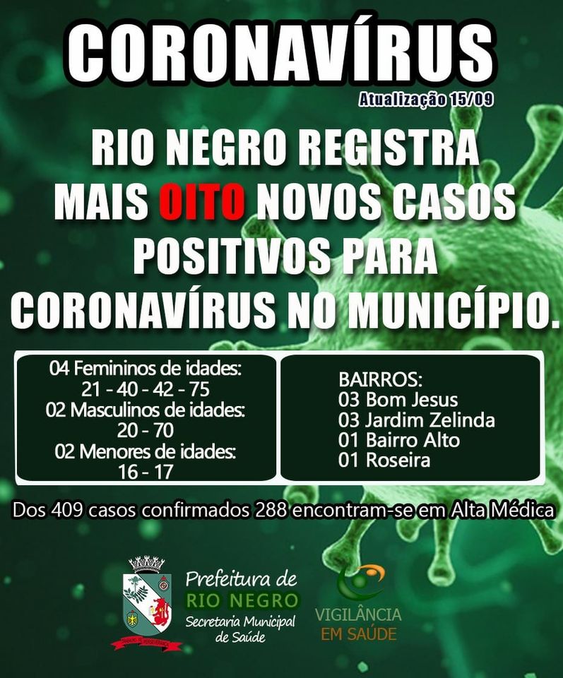 Rio Negro registrou oito novos casos de Covid-19 nesta terça-feira (15). Atualmente há 409 casos confirmados, sendo que 288 pessoas estão recuperadas.