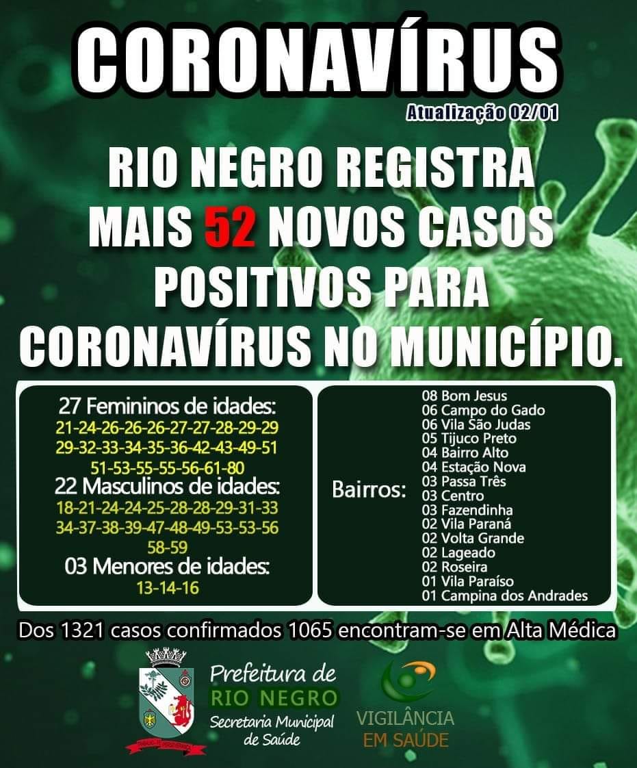 Rio Negro chegou 1321 casos positivos de Covid-19, sendo que 1065 pessoas já estão recuperadas. Somente neste sábado a cidade registrou 52 novos casos. Confira o boletim: