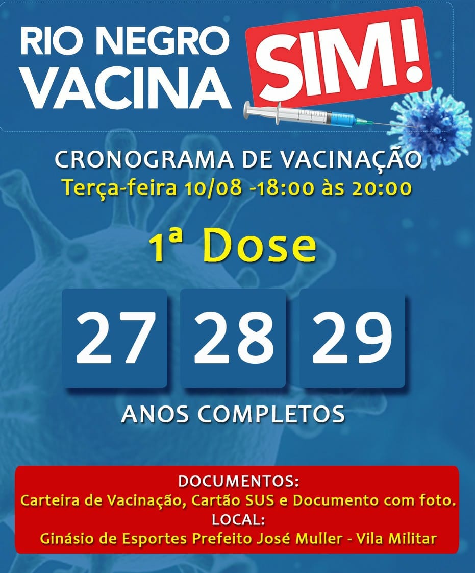 A cidade de Rio Negro divulgou o cronograma da vacinação (primeira dose) contra a Covid-19 para o público de 27, 28 e 29 anos de idade completos ou mais.