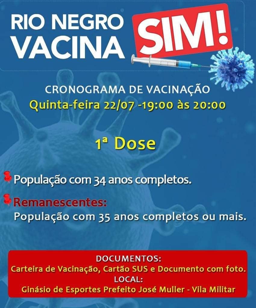 A cidade de Rio Negro divulgou o cronograma da vacinação (primeira dose) contra a Covid-19 para o público de 34 anos de idade completos sem comorbidades.