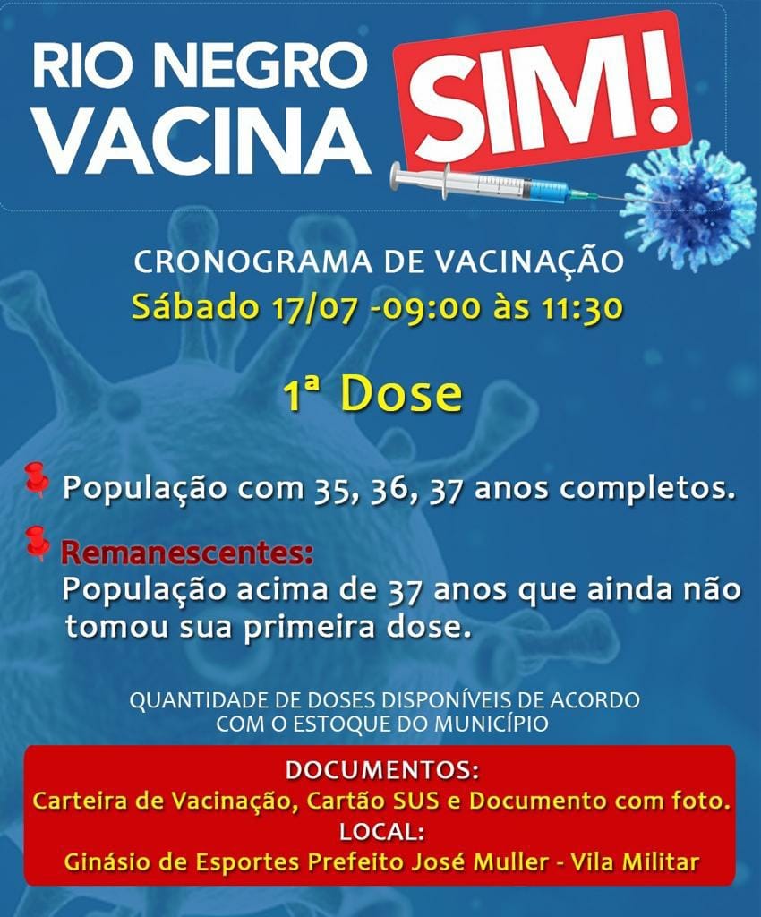 A cidade de Rio Negro divulgou o cronograma da vacinação (primeira dose) contra a Covid-19 para o público de 35, 36 e 37 anos de idade completos sem comorbidades.