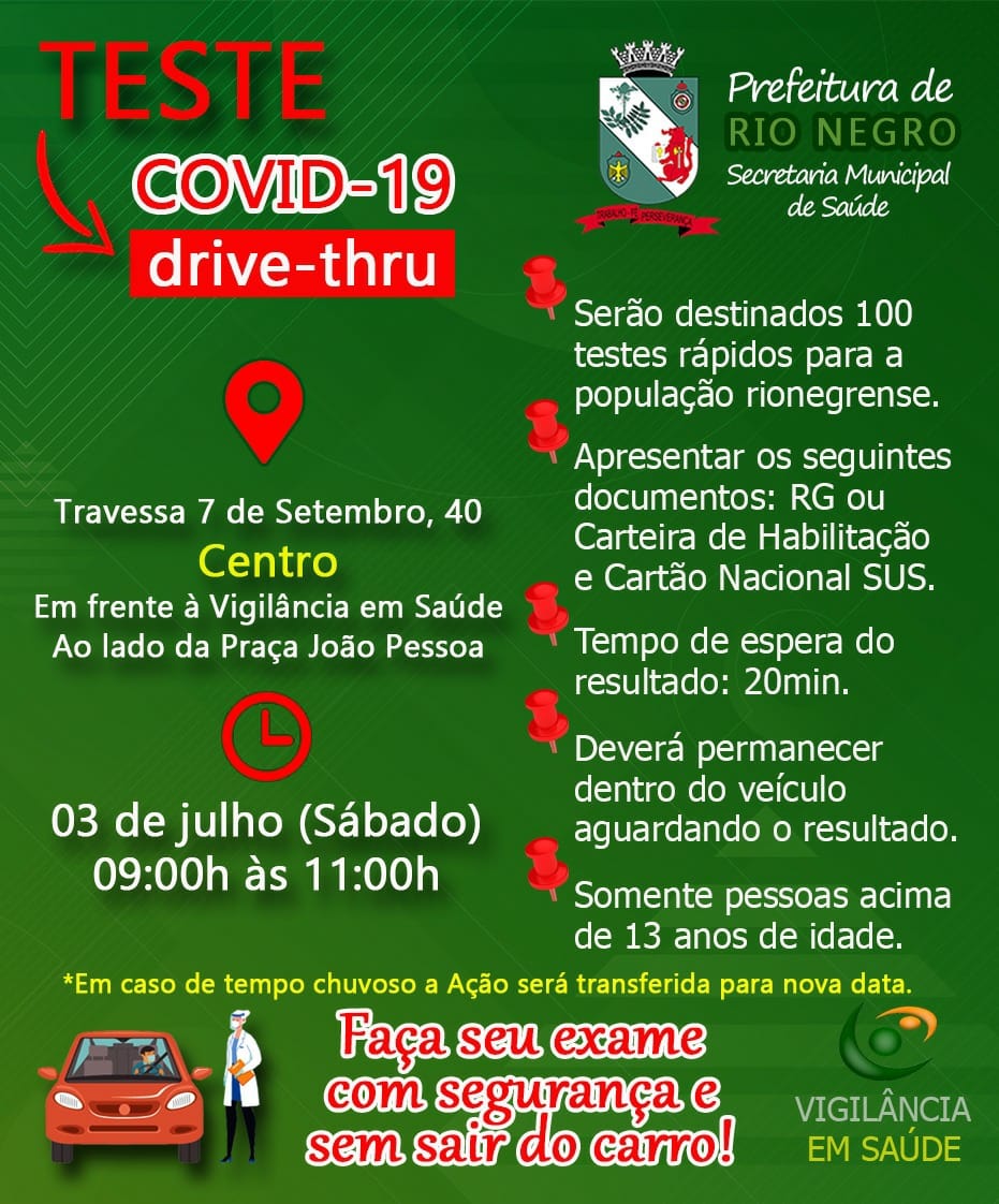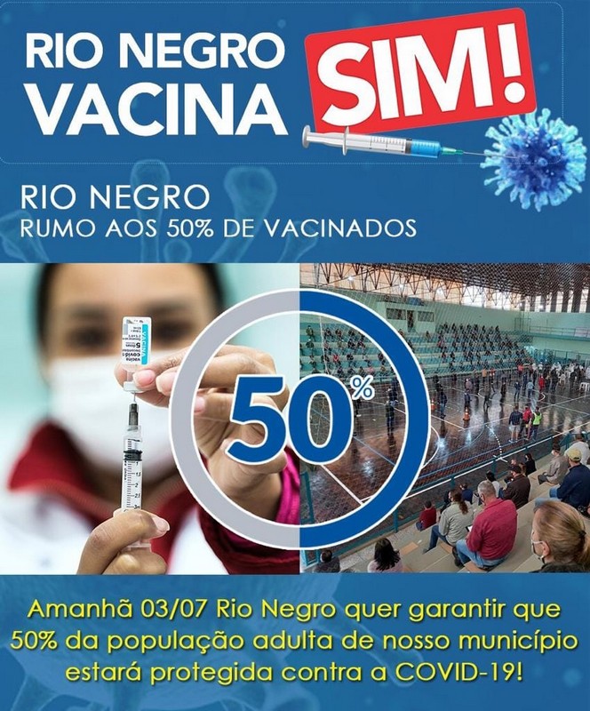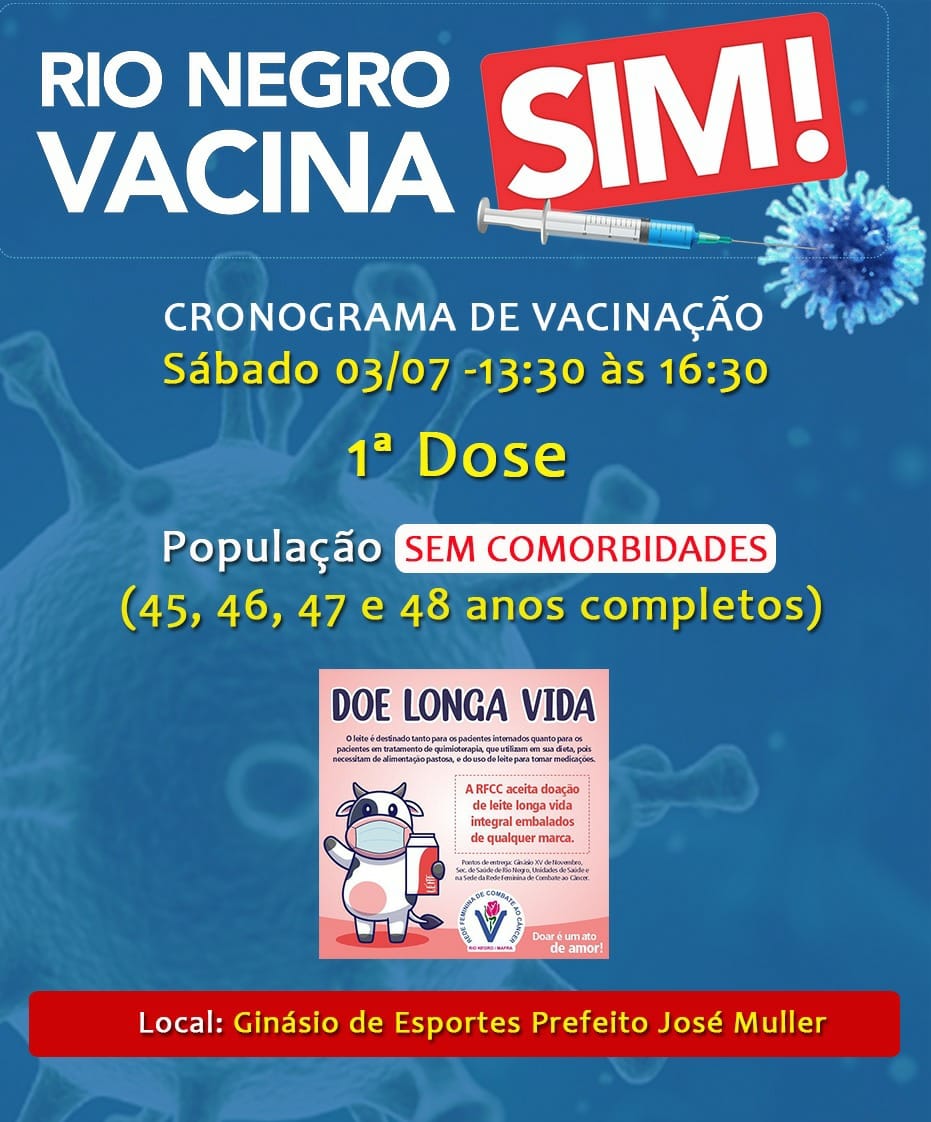 A cidade de Rio Negro divulgou o cronograma da vacinação (primeira dose) contra a Covid-19 para o público de 45, 46, 47 e 48 anos de idade completos sem comorbidades.