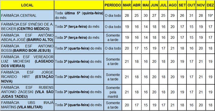 As farmácias estarão fechadas sempre em dias especÃficos nas terceiras e quartas semanas de todos os meses. Os fechamentos foram planejados permitindo que a população não fique desassistida podendo retirar os medicamentos em dia de fechamento em outras farmácias de outras Unidades Básicas de Saúde (UBS).