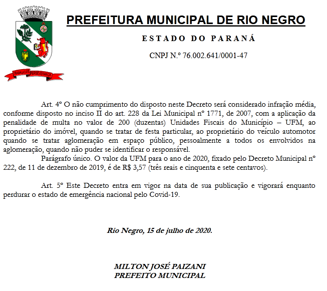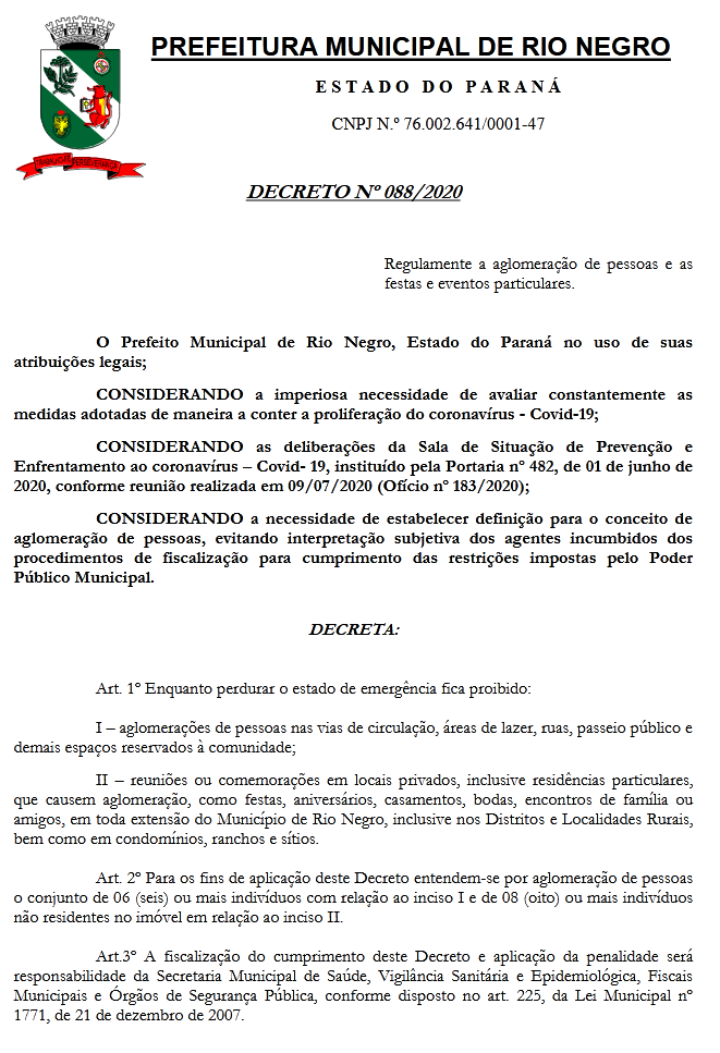 O novo decreto de Rio Negro publicado ontem, dia 15, proÃbe as reuniões ou comemorações em locais privados, inclusive residências particulares, que causem aglomeração, como festas, aniversários, casamentos, bodas, encontros de famÃlia ou amigos, em toda extensão do municÃpio, inclusive nos distritos e localidades rurais, bem como em condomÃnios, ranchos e sÃtios.