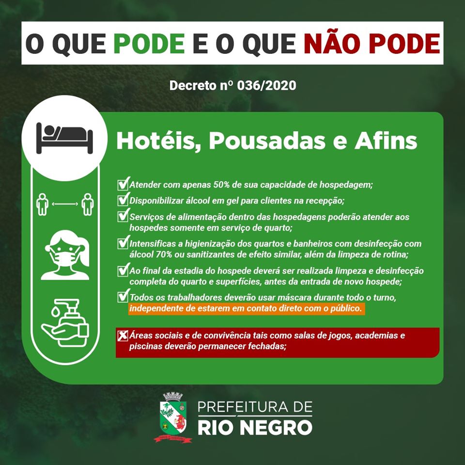 Confira abaixo o que cada estabelecimento deve fazer para evitar a propagação do vÃrus. Lembrando que os clientes também devem respeitar todas as recomendações. Além disso, o uso de máscara é obrigatório em estabelecimentos, parques, praças e vias do municÃpio. Da mesma forma o consumo de bebidas alcoólicas está proibido nos espaços públicos.