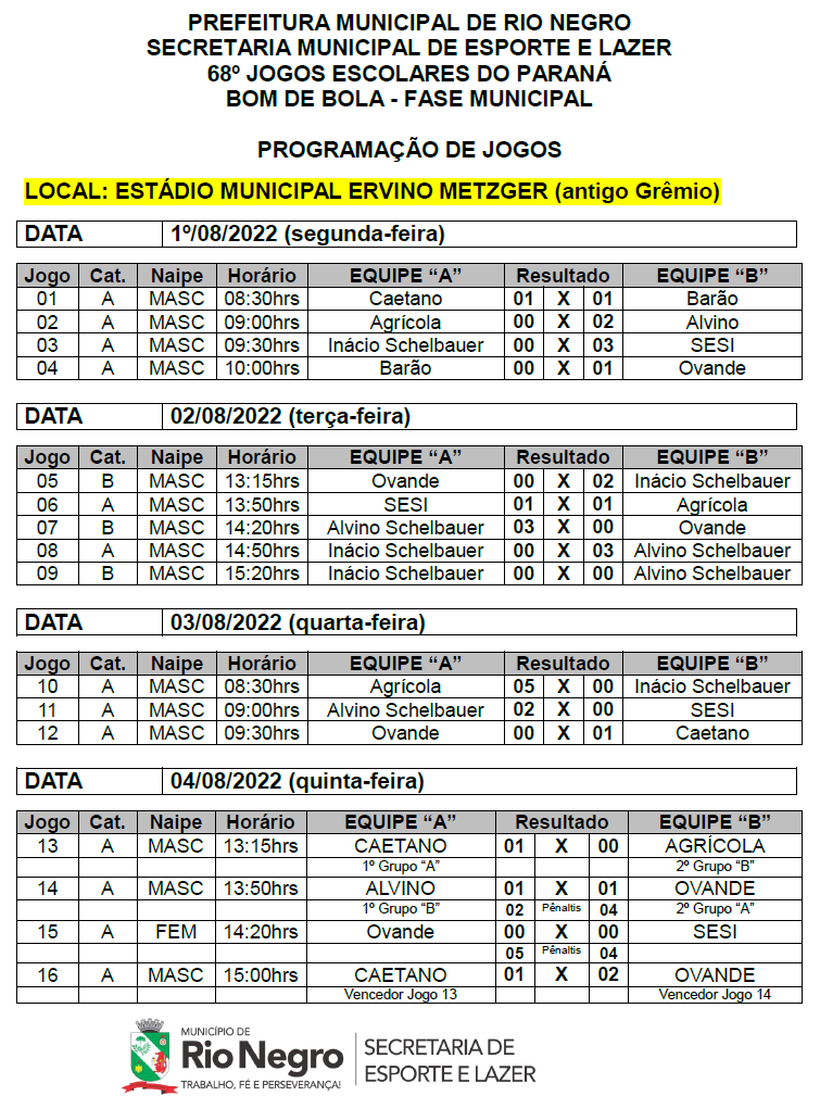 Na última quinta-feira (04), foi encerrada em Rio Negro a fase municipal dos Jogos Escolares Bom de Bola. As partidas de futebol foram realizadas no Estádio Municipal Ervino Metzger envolvendo diretamente cerca de 240 estudantes do município.