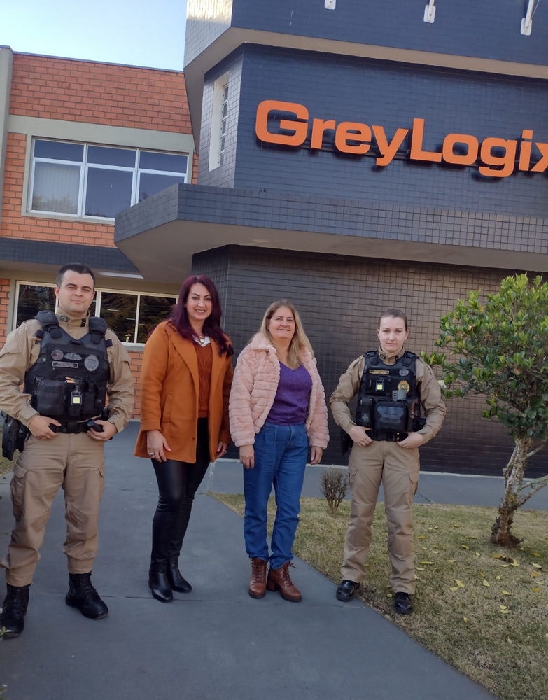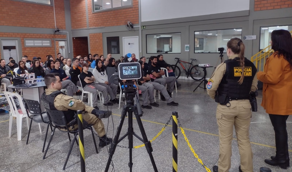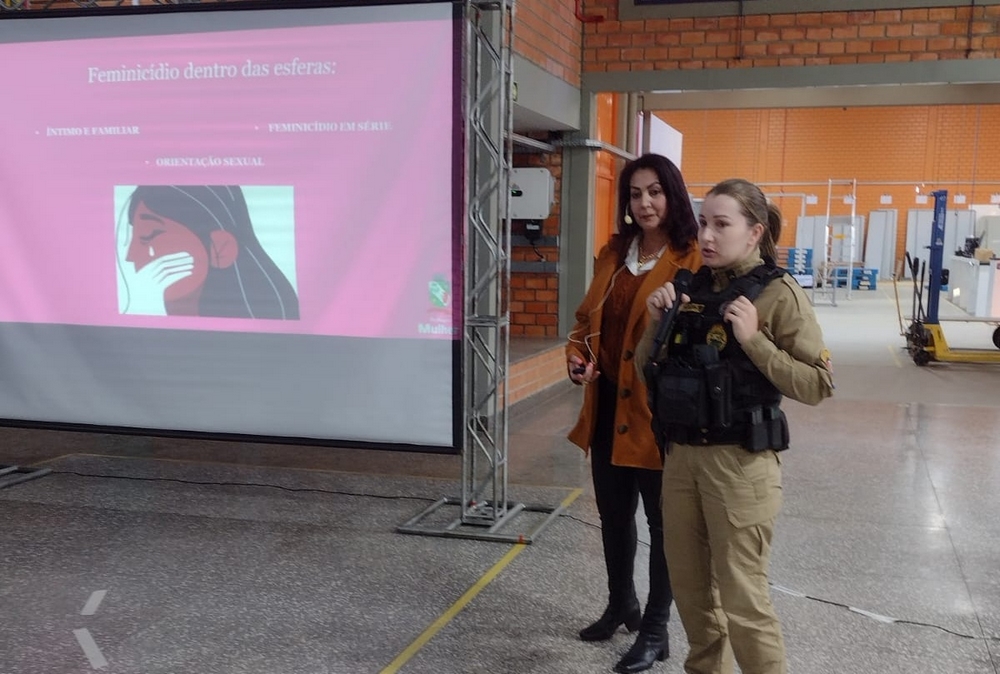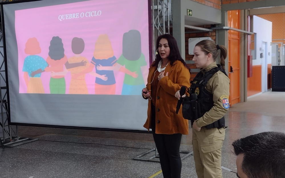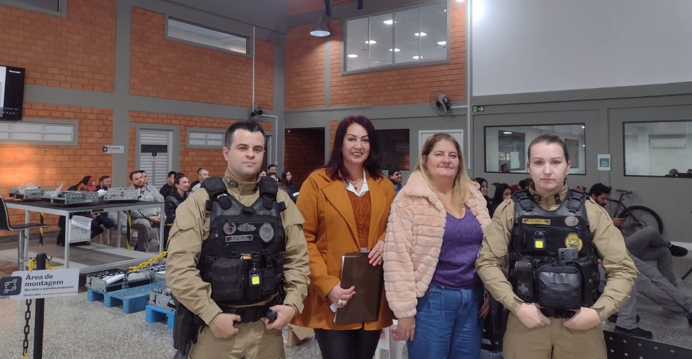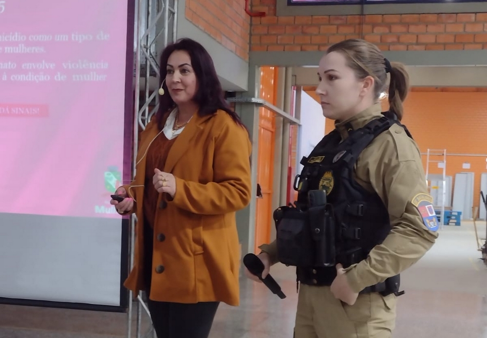 A apresentação foi realizada pela diretora do departamento, Édina Regina dos Santos, e pelos policiais militares Fernanda e Lucas, que fazem parte da Patrulha Maria da Penha. A ação também teve a participação da servidora municipal Nelice Hames.