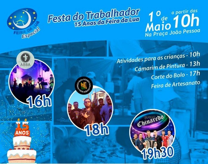 No perÃodo da tarde terá o corte do bolo comemorativo aos 15 anos da Feira da Lua e a partir das 18h haverá apresentações musicais com a Banda Bicho Homem e o Grupo Chinaredo.