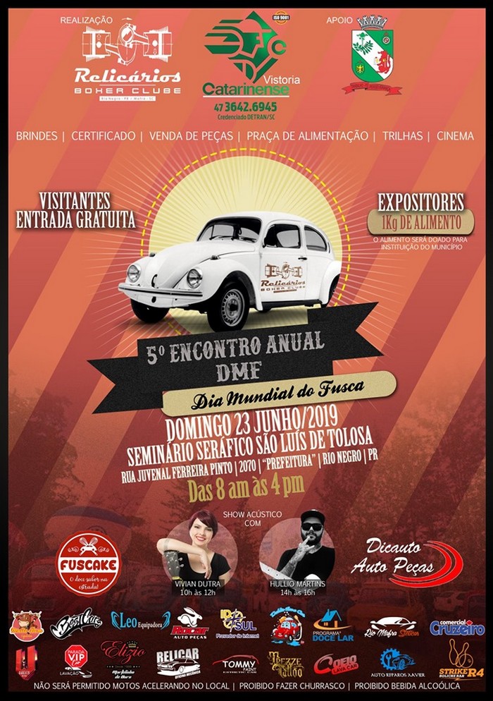 A 5ª edição do Dia Mundial do Fusca será realizada no dia 23 de junho a partir das 8h no Parque São LuÃs de Tolosa. A entrada é gratuita para visitação e 1 kg de alimento para os expositores de veÃculos. Todos em aircooleds e derivados estão convidados.