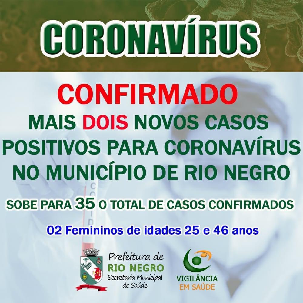 Dois novos casos de coronavÃrus foram registrados em Rio Negro nesta quinta-feira (02). São duas mulheres, com 25 e 46 anos.