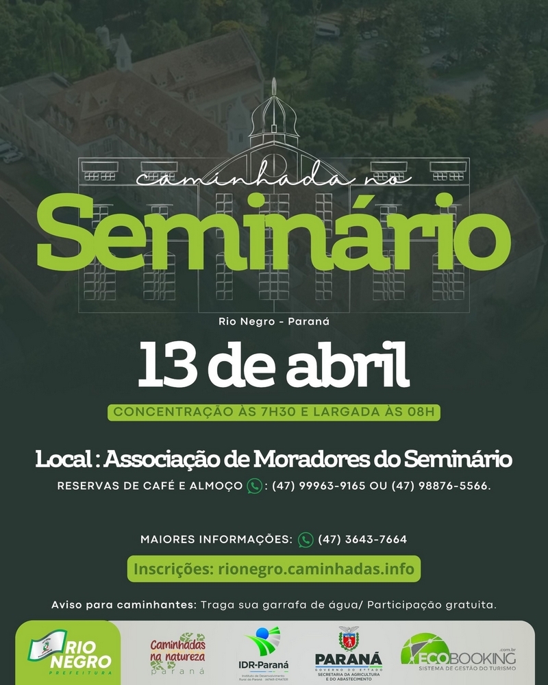 Neste domingo (13) será realizada a Caminhada no Seminário, com um percurso de 12 km com belas paisagens. O evento é uma grande oportunidade para quem adora caminhar na natureza e conhecer belos locais com trilhas e estradas.