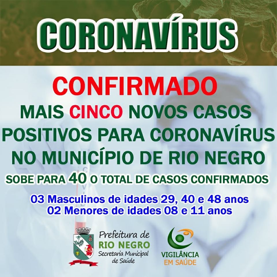 Mais cinco casos positivos de coronavÃrus foram confirmados em Rio Negro nesta sexta-feira, entre eles estão duas crianças, com 8 e 11 anos de idade.