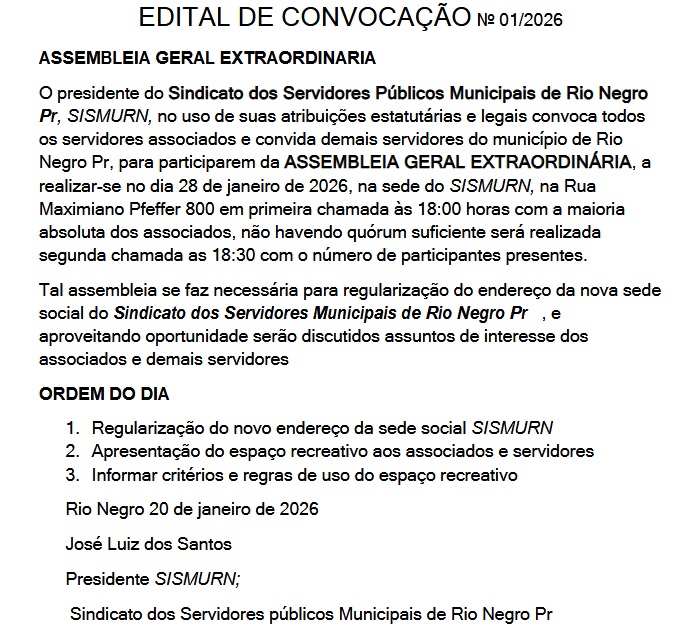 Edital de Convocação – Sindicato dos Servidores Públicos Municipais de Rio Negro