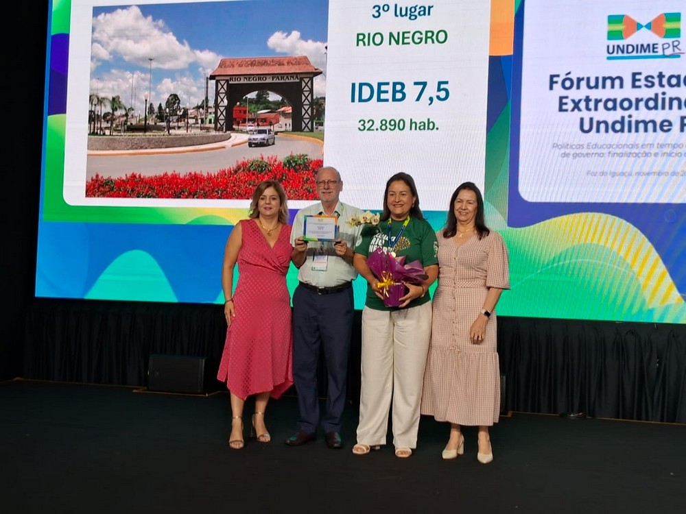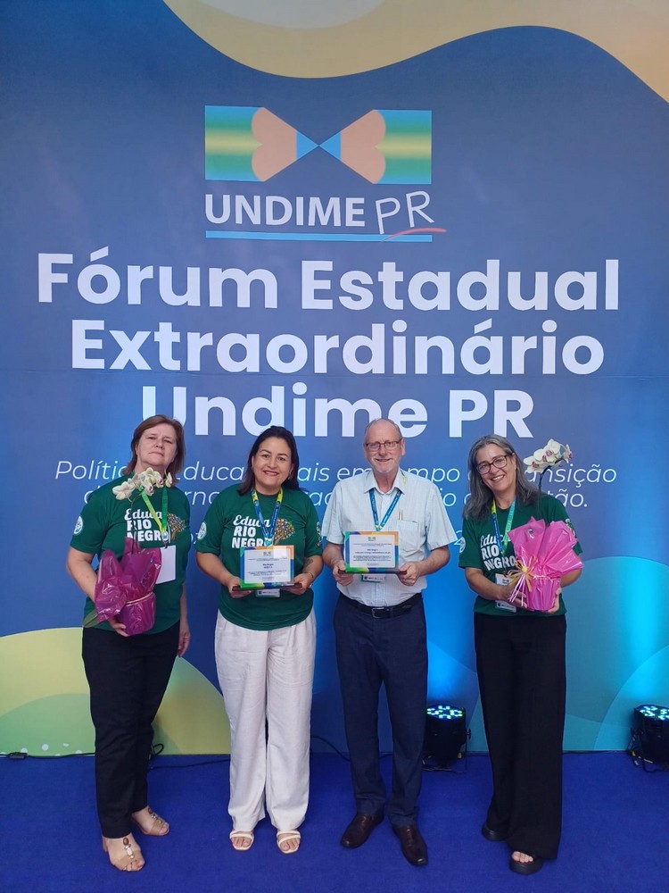 Nesta quinta-feira (21), o município de Rio Negro recebeu dois importantes prêmios na área da educação durante o Fórum Estadual Extraordinário da Undime Paraná, que tem como missão articular, mobilizar e integrar os dirigentes municipais de educação para construir e defender a educação pública com qualidade social. O evento ocorreu em Foz do Iguaçu.