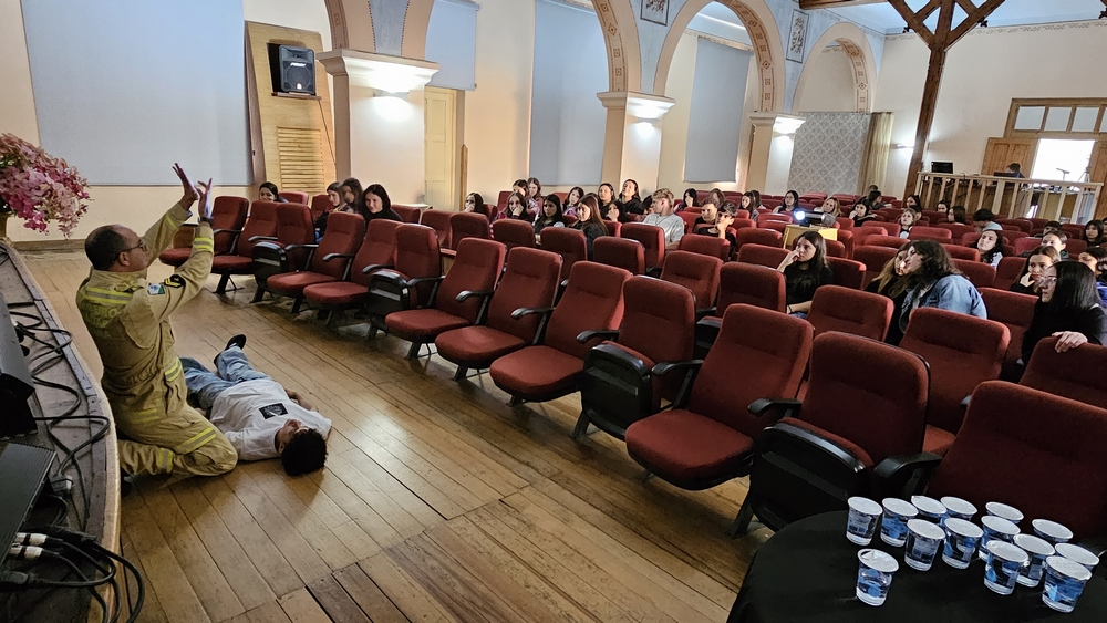 Os estagiários participaram da capacitação de primeiros socorros, que foi realizada no Cine Teatro Antônio Cândido do Amaral pelo soldado cabo Rafael Pedro Wolski do Corpo de Bombeiros de Rio Negro.