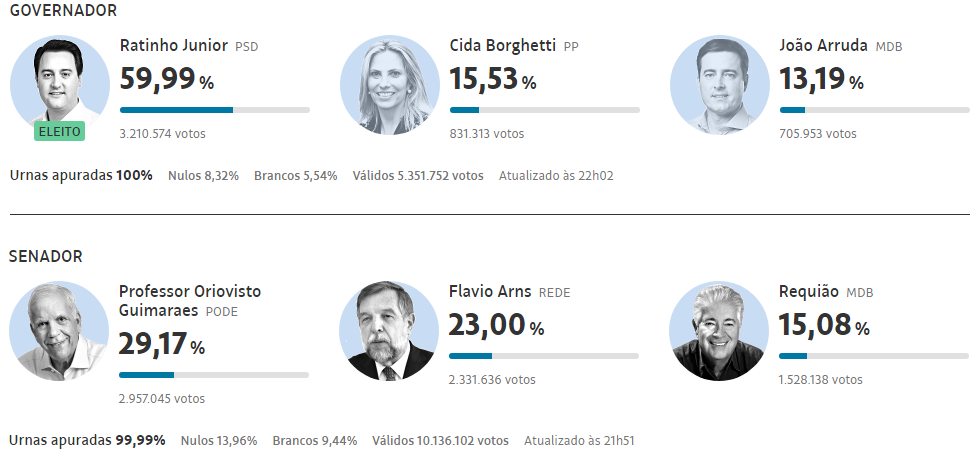 Ratinho Junior (PSD) é eleito Governador do Paraná no primeiro turno. O candidato recebeu 3.210.574 votos, o que representa 59,99% dos votos válidos. Cida Borghetti (PP) ficou na segunda colocação com 831.313 votos (15,53% dos votos válidos).
