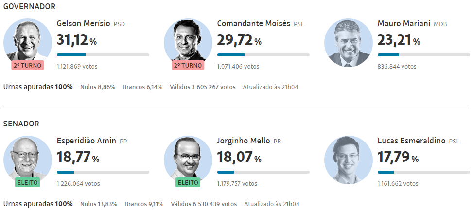 A eleição para governador de Santa Catarina será decidida no segundo turno entre os candidatos Gelson Merísio (PSD) e Comandante Moisés (PSL).