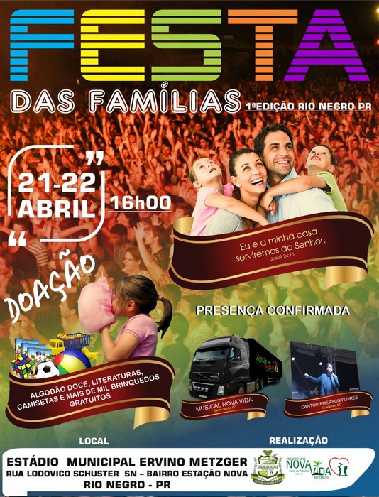 Nos dias 21 e 22 de abril será realizada a 1ª Edição da Festa das Famílias em Rio Negro. O evento ocorrerá no Estádio Municipal Ervino Metzger, situado no bairro Estação Nova. A programação terá início às 16h com entrada gratuita.