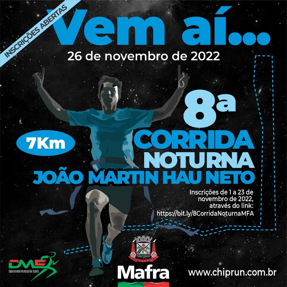 Tudo pronto para a 8ª Corrida Noturna “Prof João Martin Hau Neto” que acontece neste sábado, dia 26 de novembro. A Prefeitura de Mafra, por meio do Departamento de Esportes da Secretaria Municipal de Educação, Esporte e Cultura realizam esta ação que visa estimular a prática desportiva como elemento da promoção da saúde. Podem participar praticantes de corrida de rua de ambos os sexos, com idade a partir de 16 anos.
