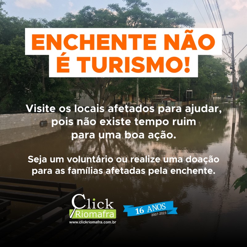 O bom senso é fundamental! E todos podem visitar os locais para ajudar, pois não existe tempo ruim para uma boa ação. Seja um voluntário ou realize uma doação para as famÃlias afetadas pela enchente. Confira os pontos de arrecadação: