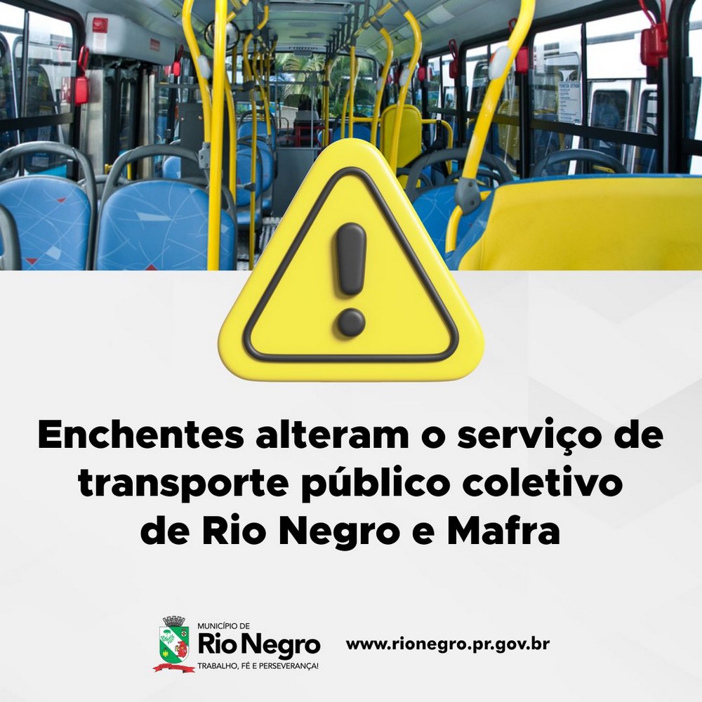 O Consórcio Intermunicipal de Mobilidade Urbana (CIMU) de Rio Negro-PR e Mafra-SC informa que devido à s enchentes que atingem os dois municÃpios, algumas linhas do transporte público coletivo terão alterações nesta segunda-feira, dia 09.