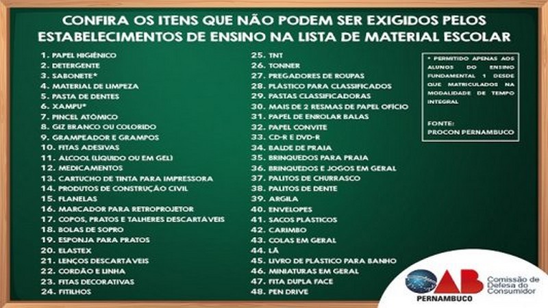 Segundo a Comissão do Consumidor da OAB/SC entre os itens que não podem ser exigidos estão os materiais de uso coletivo. A Comissão aponta ainda que materiais utilizados pelos professores em sala de aula também não podem ser exigidos aos alunos, assim como produtos de higiene e limpeza.